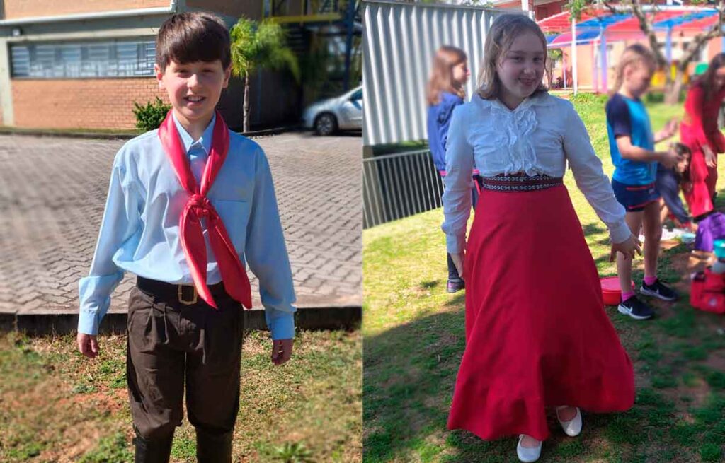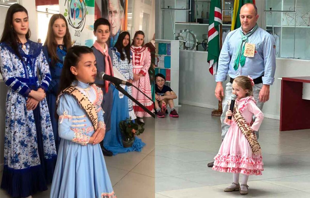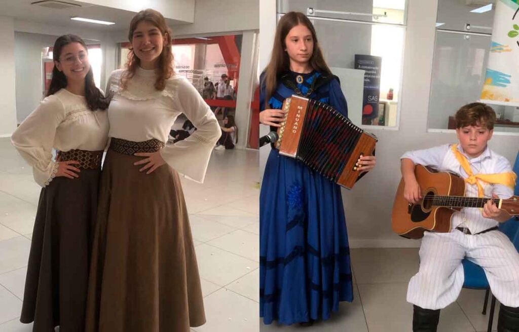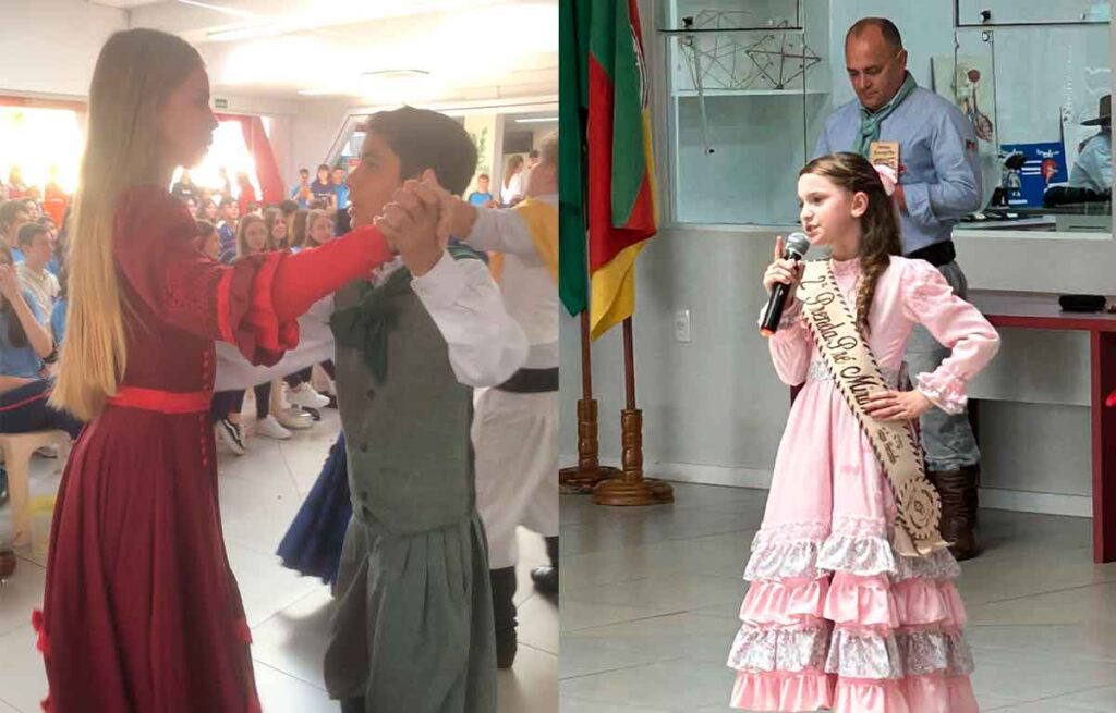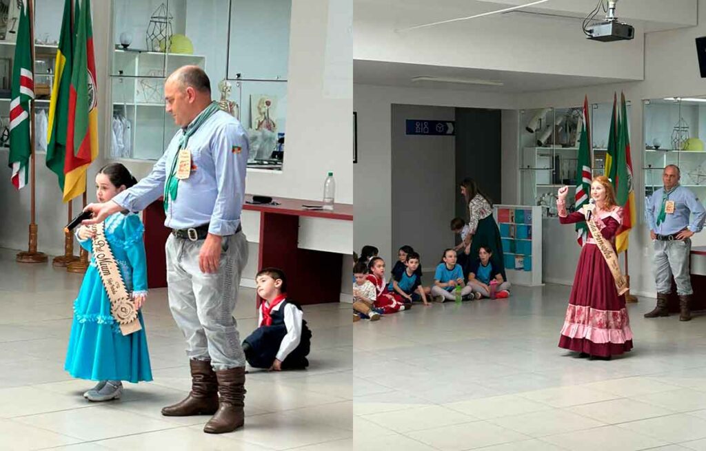 Já no turno da tarde, a programação contou com trabalhos pedagógicos temáticos, apresentações de danças e a presença marcante dos trajes típicos gaúchos.
