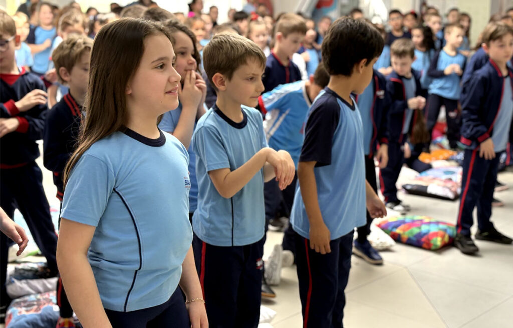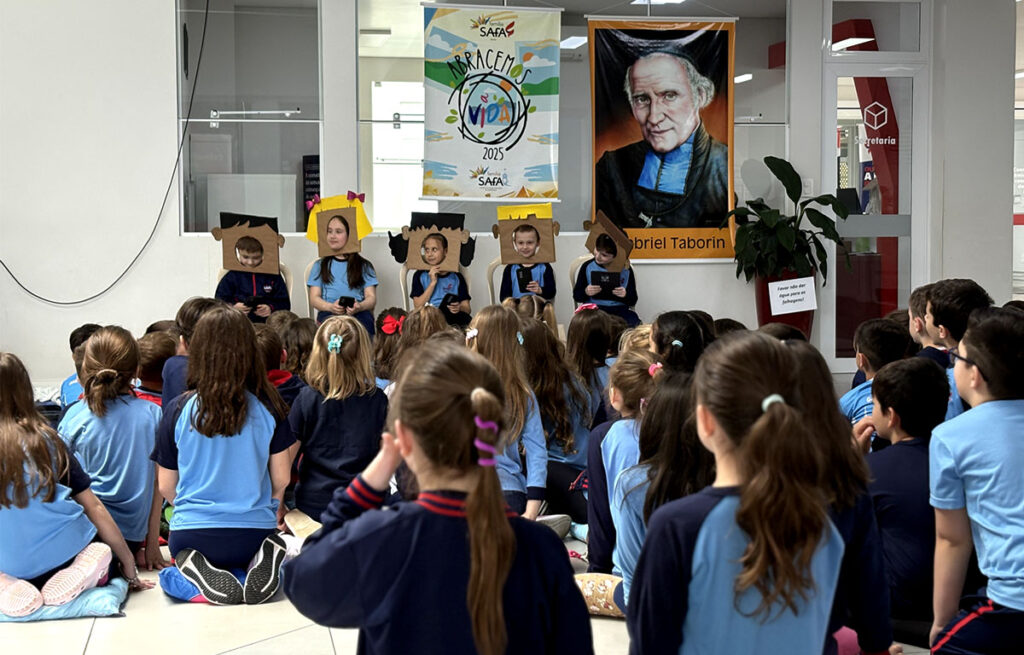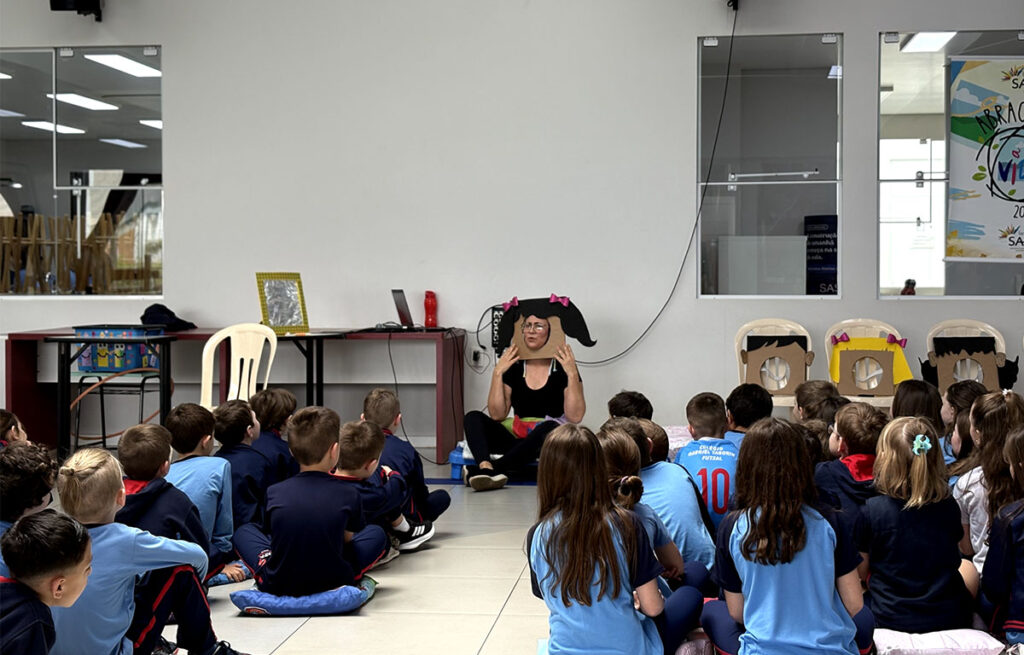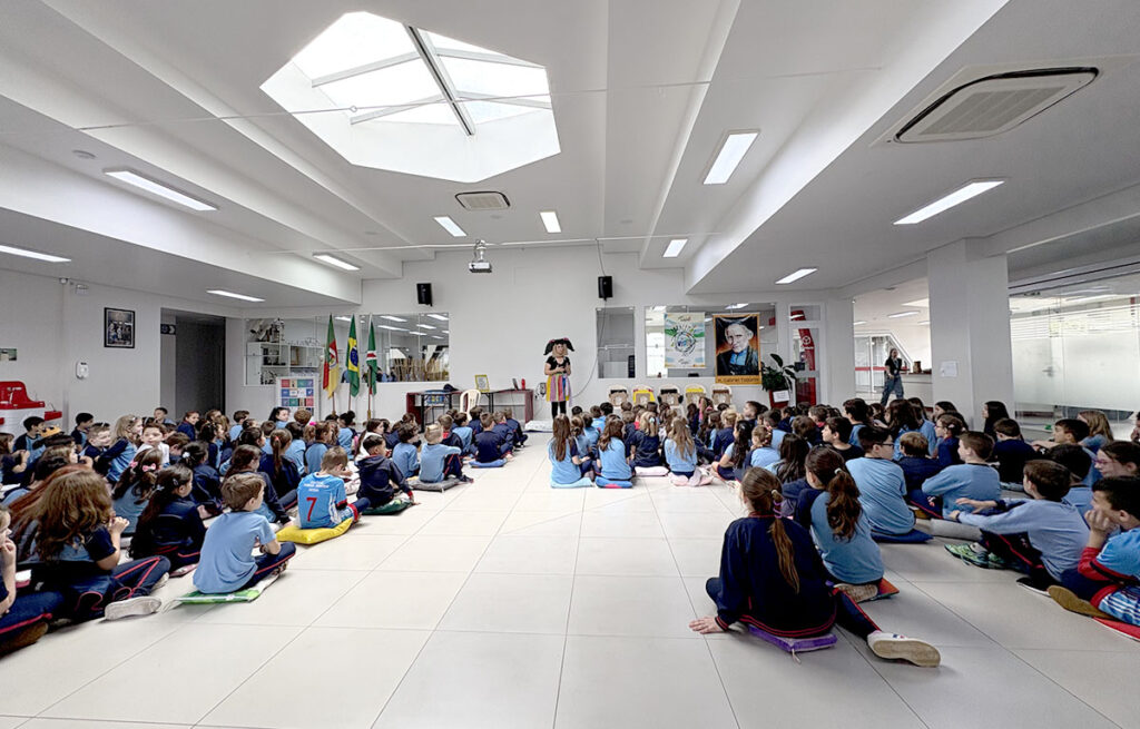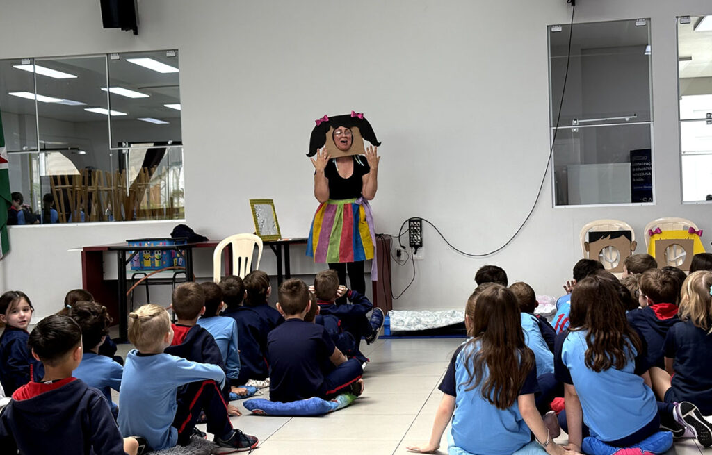 A prática de contar histórias é uma das maneiras mais eficazes de despertar a curiosidade, fomentar a criatividade e estimular a empatia nos alunos, ajudando-os a entender diferentes perspectivas e sentimentos. Pensando nisso, na semana da criança, tivemos um momento de contação de história, para o qual foi escolhido o livro infantil “A Menina da Cabeça Quadrada” de Emília Nuñez que conta a história de Cecília, uma menina que, ao passar muito tempo em telas (tablet, celular, TV), acorda com a cabeça quadrada. A avó de Cecília a incentiva a resgatar brincadeiras, como bola, ioiô, pião, bolhas de sabão entre outras, para “desquadradizar” a sua cabeça e voltar a ter espaço para ideias. O objetivo desta contação de história, além de divertir, foi incentivar o equilíbrio entre o uso de tecnologias digitais e as brincadeiras tradicionais na infância, mostrando a importância de atividades ao ar livre, o desenvolvimento da criatividade e o fortalecimento dos laços afetivos, para que as crianças não fiquem presas às telas.