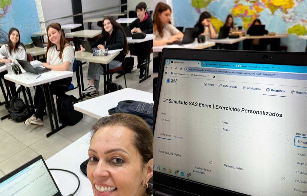 A turma do 3º ano do Ensino Médio, acompanhada da professora de Biologia, Renata Confortin, realizou uma aula muito especial experienciando o Ensino Individualizado proporcionado pelo Sistema Ari de Sá  (SAS). Ao longo do ano o Sistema disponibiliza uma série de avaliações oficiais, englobando simulados de diversos cursos vestibulares do Brasil e do ENEM. A correção dessas atividades pelo SAS permite o diagnóstico de áreas, habilidades e competências que estão se mostrando mais difíceis aos alunos em cada disciplina/conteúdo. Mais que isso, são ofertadas na sequência exercícios especializados, ou seja, para cada aluno de acordo com o seu resultado para retomadas e recuperações de aprendizagem. As imagens dizem muito e mostram a atenção dessa meninada em aprender e (re) aprender, transformando dúvida e dificuldades em conhecimento de verdade.