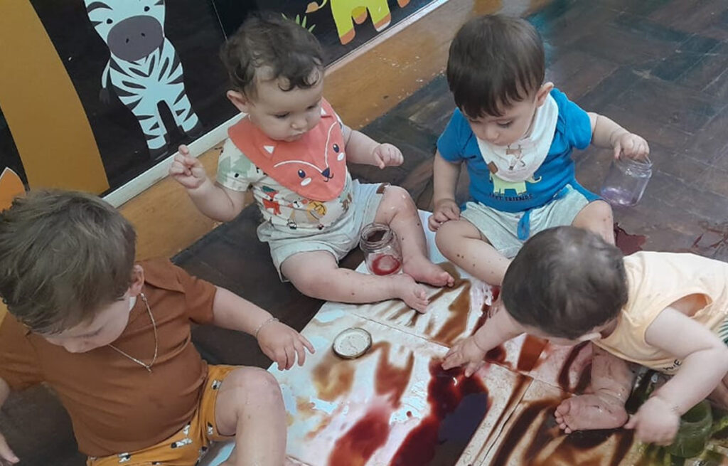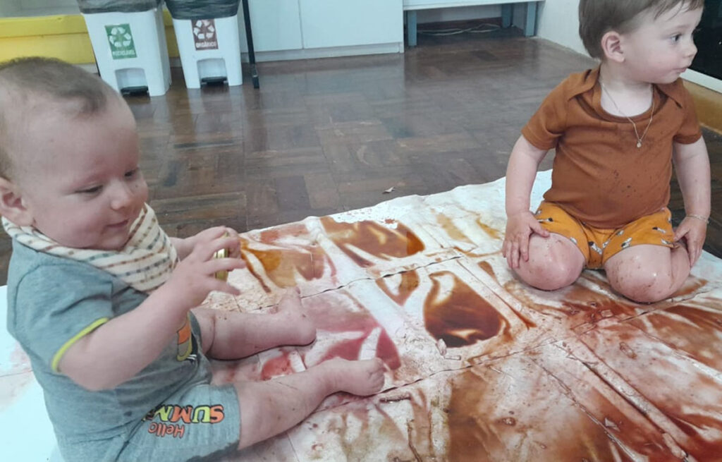 A atividade com tintas naturais proporciona experiências sensoriais por meio da exploração livre de pigmentos produzidos com alimentos como café, feijão, beterraba, camomila, açafrão, colorau, erva-mate e cacau. Essa proposta estimula a percepção tátil, visual e motora das crianças, favorecendo a expressão de emoções e a descoberta de diferentes cores, aromas e consistências. Além disso, amplia o repertório sensorial, respeitando o ritmo e as preferências individuais de cada bebê.