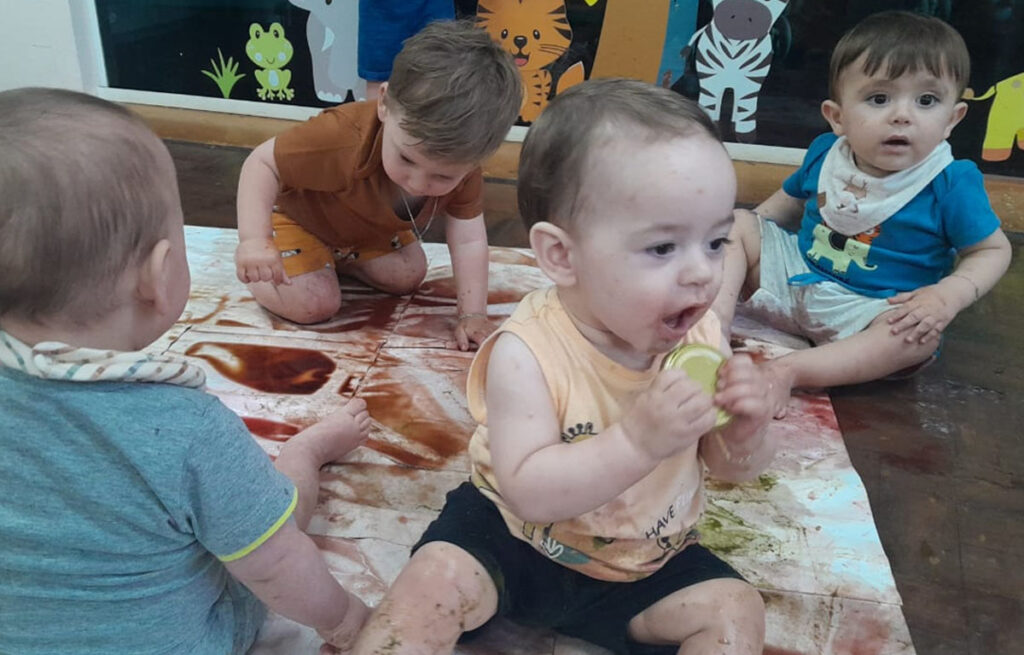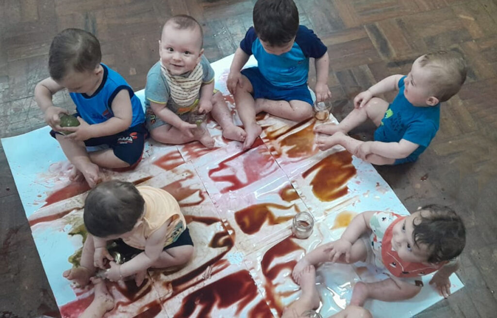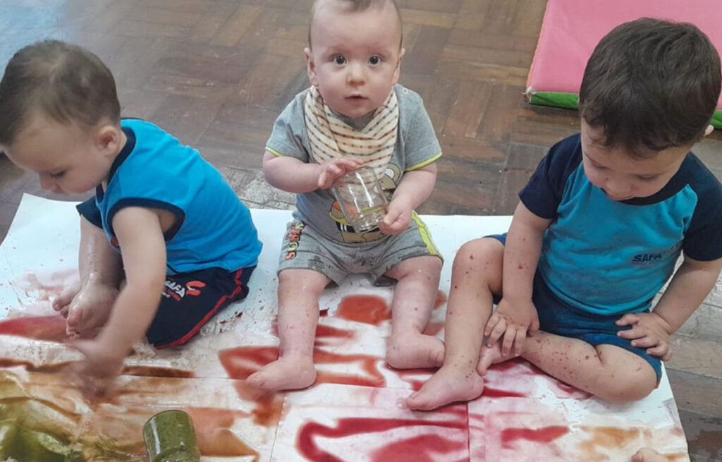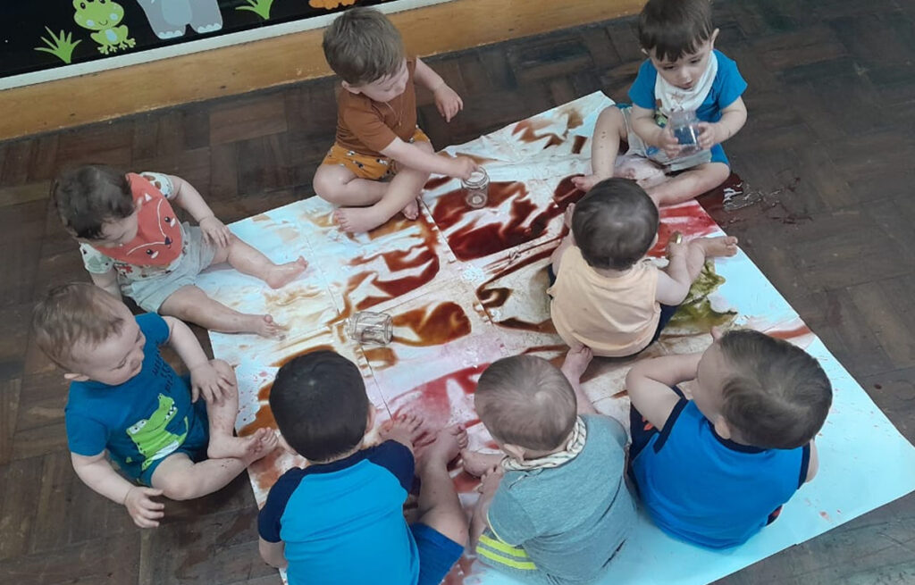 As crianças bem pequenas desenvolvem a coordenação motora ampla e fina através de toques, pinceladas e movimentos com as mãos. A atividade favorece a expressão e a comunicação não verbal, permitindo que manifestem curiosidade, façam escolhas e expressem reações durante a exploração.
