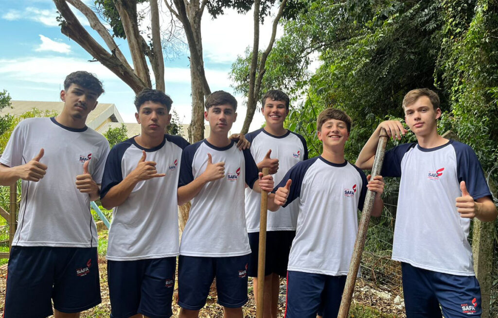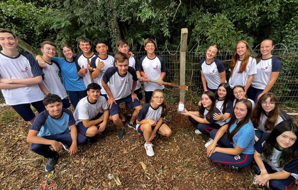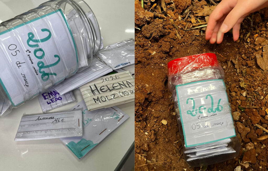 A turma do 1º ano (311 2026) do Ensino Médio, acompanhada da professora de Biologia, Renata Confortin, realizou uma atividade especial por esses dias: a Cápsula do Tempo. Fruto do amadurecimento cognitivo, orgânico  e emocional da turma, a dimensão humana também tornou-se assunto de aula de Bio. Assim, sonhos e objetivos, metas e intenções foram escritas e devidamente armazenadas e enterradas em um espaço natural da Escola. A intenção é desenterrar e abrir apenas nos últimos dias do terceirão. A expectativa já é grande, e a busca por realizar tais propósitos maior ainda. As imagens dizem muito e mostram a motivação dessa galera em evoluir, sempre.