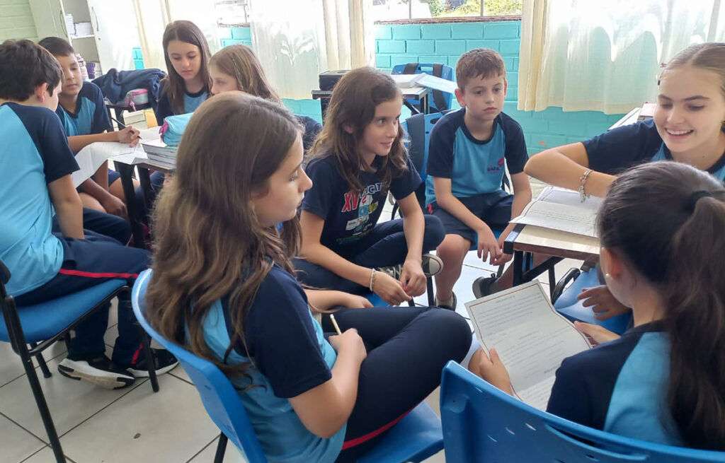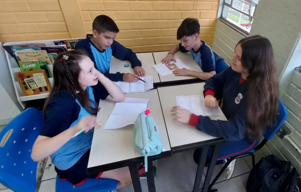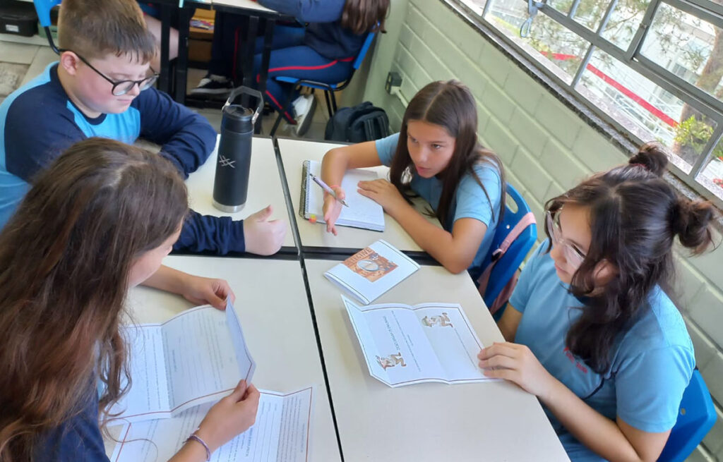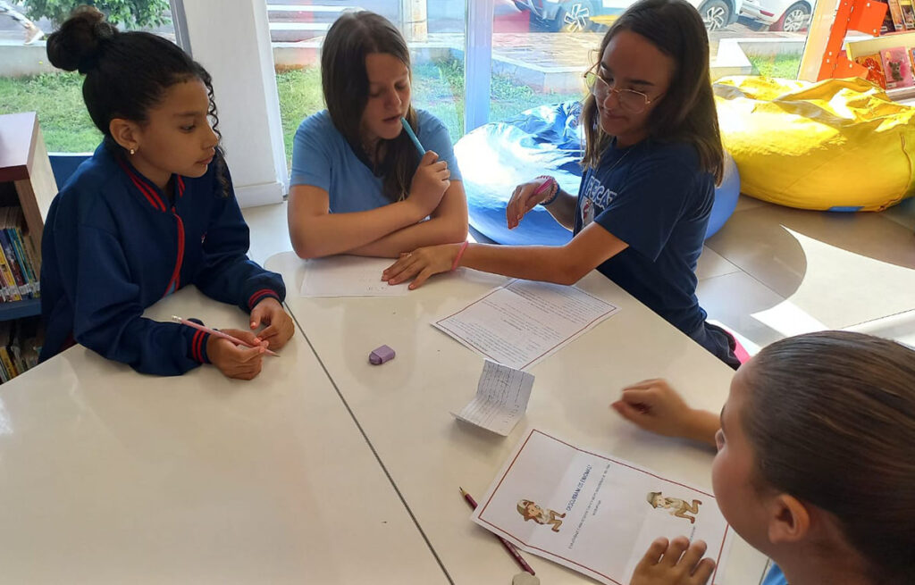 Divididos em grupos, eles analisaram pistas, discutiram ideias e elaboraram estratégias para desvendar os mistérios propostos. A atividade estimulou o pensamento crítico, a argumentação e a colaboração, tornando a aprendizagem mais dinâmica e envolvente, além de despertar o interesse pela leitura e pelo universo investigativo.